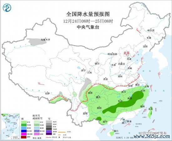 12月24日08时至25日08时,新疆沿天平地区、西藏东南部、川西高原等地部分地区有小雪或雨夹雪。江汉南部、江南、西南地区东部、华南北部和西部、海南岛东部、台湾岛等地部分地区有小雨,其中,湖南中南部、江西中部和东北部、浙江西南部、广西西南部和北部等地部分地区有中雨。吉林西部、西藏中北部等地部分地区有4~6级风;渤海、渤海海峡、黄海大部海域、东海大部海域、台湾海峡将有6~8级大风、阵风9级。
