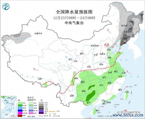 12月23日08时至24日08时,东北地区、新疆南疆西部山区、华北东部、山东北部等地部分地区有小到中雪或雨夹雪,其中,黑龙江中东部、吉林中部、辽宁东部局地大到暴雪(10~12毫米)。黄淮东部、江淮、江汉大部、江南北部和西部、西南地区东部、广西、广东东南部沿海、海南岛东部、台湾岛东部等地部分地区有小雨,其中,湖南西部、贵州东北部、广西中部等地部分地区有中雨。内蒙古中东部、辽东半岛、西藏中北部等地部分地区有4~6级风;渤海、渤海海峡、黄海大部海域、东海西部海域、台湾海峡、巴士海峡、南海北部海域将有6~7级大风、阵风8~9级。