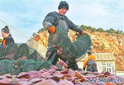 山东省烟台市芝罘岛西口渔港的渔民在整理扇贝。 孙文潭摄(东谈主民图片)
